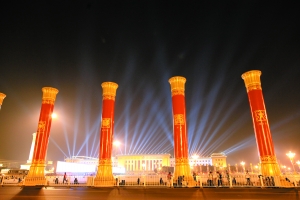 廣場東側,代表漢族、回族等民族的7根柱子首先試驗了彩燈,柱身內的白、黃、紫、紅等彩光透過柱身的民族舞蹈人像射出來,不斷變幻。