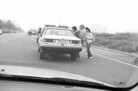 在維持交警的眼皮底下,這輛警車在海文幼兒園對面的黃河東路西側停下來。司機座上走下一名年齡稍大的婦女,警車后門走下一名年輕一點的女子,懷里抱著一名幼兒。她們徑直穿過馬路,往海文幼兒園大門口走去。