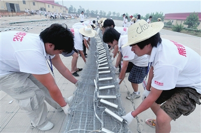 最后一個困擾工作人員的難題就是,如何給網幕焰火防雨。技術人員使用了電子加固器,量體裁衣,給每一發煙花定制了“風雨衣”,所有“風雨衣”統一尺碼,就連每發煙花套上“風雨衣”時扣到第幾個扣,均執行統一規格。(盧國強)