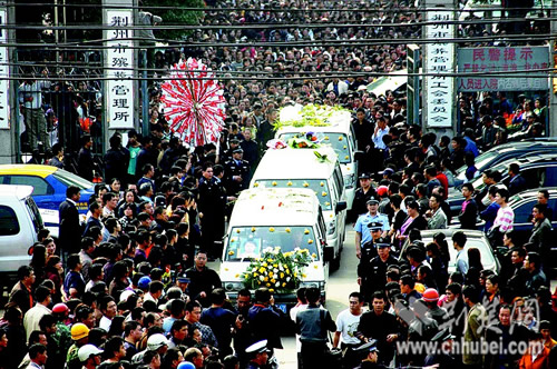 近萬名學(xué)生和社會(huì)各界群眾自發(fā)地參加追悼會(huì)。人們?cè)缭绲刳s到荊州市殯儀館,手捧菊花、富貴竹,胸別白花,緩緩進(jìn)入靈堂,送英雄最后一程。