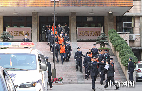 中新網(wǎng)重慶11月3日電(銀雪)重慶抓獲的十九個(gè)涉黑團(tuán)伙中唯一女首犯謝才萍3日上午一審宣判:謝才萍被控的組織、領(lǐng)導(dǎo)黑社會(huì)性質(zhì)組織罪、開(kāi)設(shè)賭場(chǎng)罪、非法拘禁罪、容留他人吸毒罪、行賄罪五宗罪成立,被判有期徒刑18年,并處罰金102萬(wàn)元人民幣。圖為判決后謝才萍團(tuán)伙成員走出法庭。