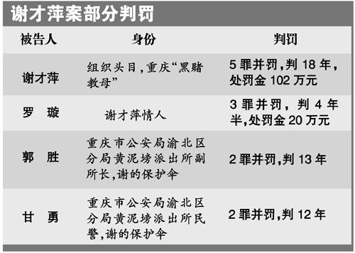 昨天上午,重慶市第五中級人民法院對謝才萍等22人“涉黑”案一審公開宣判。謝才萍犯組織、領(lǐng)導黑社會性質(zhì)組織罪、開設賭場罪等罪被判處有期徒刑18年,其余21名被告人分別被判處1至13年不等的有期徒刑。