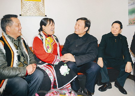 李源潮一下火車,就與同來(lái)慰問(wèn)的省委書(shū)記、省人大常委會(huì)主任劉奇葆一起直奔北川縣看望災(zāi)區(qū)群眾,來(lái)到剛剛重建起來(lái)的擂鼓鎮(zhèn)吉娜羌寨。在地震中羌族同胞劉賢惠失去了丈夫、王孝萬(wàn)失去了妻子,在當(dāng)?shù)攸h委政府的關(guān)心下,他倆災(zāi)后組成了新家庭,住上了新房子,找到了新產(chǎn)業(yè),過(guò)上了新生活,有了新希望。劉賢惠緊緊拉著李源潮的手說(shuō):“感謝黨、感謝政府!全靠黨的政策好,讓我們?yōu)暮筮^(guò)上了好日子!”李源潮祝愿他們白頭偕老,日子越過(guò)越好。