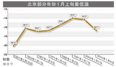 “最低氣溫-16.7℃”,昨天凌晨1點,(北京)市氣象臺發布的數據顯示,繼5日的-15.6℃之后,昨天凌晨,南郊觀象臺監測的最低氣溫跌至-16.7℃,刷新了38年來1月上旬最低溫度紀錄。根據預報,這還不是今冬寒冷天氣的終結,明天,全市可能普降小到中雪,最低氣溫仍將徘徊在-12℃左右。