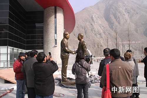 中新網(wǎng)汶川1月29日電(薛升玉 張瑤)1月29日上午,汶川縣體育館前鑼鼓陣陣,“咔嚓”的快門聲不斷,一尊高2.98米、寬1.68米、厚0.94米的“胡主席和溫總理在災(zāi)區(qū)”大型雕塑吸引了許多過往群眾駐足留影。這尊由陜西省大荔縣宣傳部捐贈的大型雕塑,將收藏到汶川縣禹羌博物館。