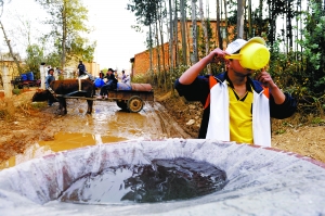 芳華鎮雙合村口,朱家付牽著牛車擠在人群中。黃牛拉著一個銹跡斑斑的鐵桶,那是全家用水的希望。抽上來的水不時的灑到人們身上,孩子們嬉笑著。