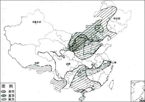 2005年我國降水總量較常年稍偏多,其中西北西部、青藏高原北部、黃淮南部偏多3成至1倍,南疆部分地區偏多1倍以上,而寧夏、內蒙古、北京、貴州等部分地區偏少1~3成,全國其余地區降水量則接近常年。年內,降水分布比較均勻,沒有出現大范圍、持續時間長的嚴重干旱,旱情較常年輕;但華南南部出現嚴重的秋冬春連旱,云南發生近50年來少見的嚴重春旱,西北東部以及內蒙古等地發生夏秋連旱,江南西部、華南一度秋旱明顯。全年受旱面積較大或旱情較重的有內蒙古、寧夏、山西、陜西、廣東、廣西、海南等省(區)。2005年旱區分布如圖所示。總體看來,全國嚴重持續性干旱范圍較小,損失偏輕,受災面積遠低于20世紀90年代以來平均水平。