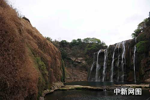 進入景區,看見一小潭碧水緩流,走過兩座索橋,便見到了聞名遐邇的黃果樹瀑布,遠遠望去,十幾股細流從崖上留下,在懸壁裸露嶙峋的石間撞擊穿梭,形成小小的瀑面,卻全然擋不住崖壁的黑青色,與往日“萬里水匯一水大,訇訇聲聞十里外”的景色相去甚遠。而在瀑布左岸,一壁的昏黃枯草更顯得觸目驚心。