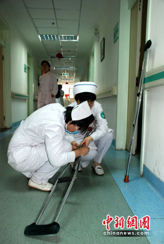 41床傷員趙新選身上皮膚有多處擦傷,腿部傷口疼,主訴沒有力氣,防止他下床活動(dòng)時(shí)摔倒,病房為他準(zhǔn)備了雙拐,護(hù)士正在病房門口細(xì)心的給他調(diào)整雙拐的高度。(完)