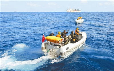 當地時間11日9時,中國海軍第五批護航編隊“廣州”艦上,16名特戰隊員和2名取證人員全副武裝,分別乘直升機和小艇前往“永歡”、“孔雀松”、“龍發”和“華強”等4艘中國商船執行隨船護衛任務。本報記者作為攝像取證人員首次與4名特戰隊員一起,登臨中遠公司所屬的散貨船“永歡”號執行為期3天的隨船護衛任務。