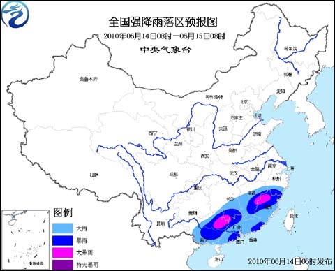 中央氣象臺6月14日06時繼續發布暴雨藍色預警: