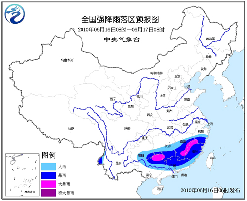 全國強(qiáng)降雨落區(qū)預(yù)報(bào)圖(2010年6月16日08時(shí)~17日08時(shí))