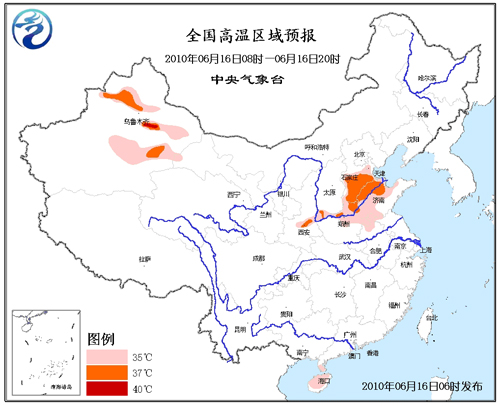 全國高溫區(qū)域預(yù)報(bào)圖(2010年6月16日08時(shí)~16日20時(shí))