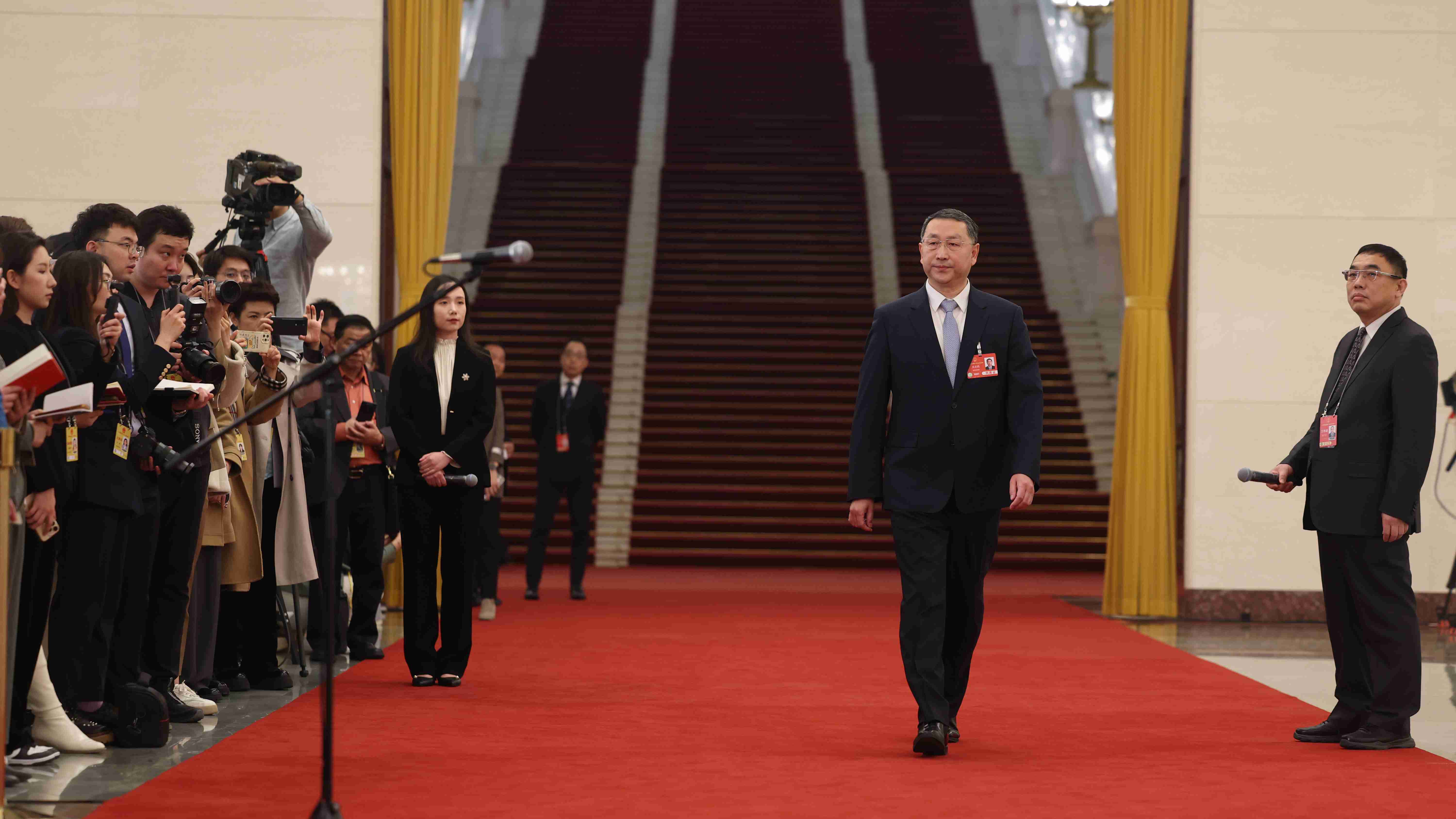 3月11日下午閉幕會后,在人民大會堂北大廳舉行十四屆全國人大三次會議第三場“部長通道”集中采訪活動,邀請部分列席會議的國務院有關部委主要負責人接受采訪。