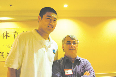 蔡晨(左)身高204公分,比尼可斯教練(右)高出一個頭,企盼成為姚明接班人。 (美國《世界日報》/吳忠國攝影)