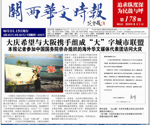 7月31日,大慶市長夏立華女士親自給日本《關西華文時報》編輯部發來了她的回信,她說:“尊敬的黑瀨道子社長:十分高興收到您的來信。對您提出成立以“大”字打頭的國際城市聯盟、建立國際城市論壇的建議深表贊同,對《關西華文時報》及您本人給予大慶的關注深表感謝。中國和日本一衣帶水,大慶和大阪特色相近。我們十分愿意并真誠希望通過貴報,邀請大阪市加入我們的城市聯盟。大慶愿與貴報一道努力,積極促成以“大”為媒的國際城市聯盟這一構想,為各城市之間開展多領域、深層次的交流與合作,搭建起新的平臺,推動彼此進一步增進友誼,擴大共識,促進亞洲經濟文化交流與發展。請您轉達我對大阪市市長的問候。并借此機會,邀請您和大阪市市長訪問大慶。”(渡邊)