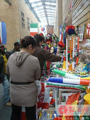 穿行在這里的商鋪之間,安全感和親切感倍增,到處是黃皮膚黑頭發,還有不時會飄送過來的鄉音。商城中的狂歡氣氛相當濃重,所有的走道里扎滿了世界杯32強的國旗。商鋪中最受歡迎的也是售賣世界杯相關商品的,每走幾步,就可以看到許多非華人的買家聚集在售賣球衣、球服、大喇叭的攤位前問價,而站在旁拍照的記者,竟因為長著華人的面孔,被屢屢誤認為是老板,遭問了不下十幾次“這個值多少錢?”實際上,世界杯官方的球衣和紀念品幾乎全都是中國制造的,當然,百家商城里出售的商品多數是沒有授權的“山寨版”,比正版貨的價格便宜數倍,因此南非各地的人,也有不少專程跑到中國城來批發便宜貨。看來,世界杯又能讓南非華人大賺一筆了。(底婕)
