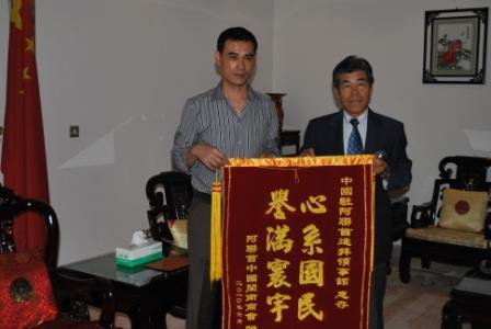 施福建家屬對施遇害后,總領館即派員與警方交涉并協助家屬迅速處理死者后事表示感謝。高總領事感謝家屬對總領館工作的肯定,并強調,錦旗是對總領館工作的鼓勵,總領館將一如既往地堅持以人為本、外交為民的理念,加大與阿司法機構合作力度,努力保障在阿中國公民的人身和財產安全。