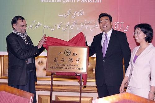 由中國國際廣播電臺在巴基斯坦開設的首家廣播孔子課堂29日在巴首都伊斯蘭堡萬豪酒店舉行揭牌儀式。這家廣播孔子課堂是受中國國家漢辦委托,由中國國際廣播電臺與巴基斯坦穆扎法爾格爾市短波收聽俱樂部合作建立的。