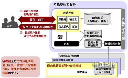 沖電氣與RECRUIT,共同開發設計了通過計算機向用戶提問,發掘用戶獨自無法表達的愿望及需求,從各種各樣大量的服務及內容中找出與之匹配信息的“階梯型檢索服務”。去年本服務已經被“信息大航海項目”作為模型服務之一所采納,進行了圍繞階梯型對話引擎的系統技術開發,在以約800用戶為對象的向跳槽者介紹職業的網域進行了驗證試驗。結果表明,與用戶平均進行了33次對話(系統提問,用戶回答后算一次對話),可以平均從用戶獲得32個屬性的信息。同時進行了問卷調查,24%的用戶回答通過對話得到了提示,了解了自己的需求,驗證了通過與計算機對話,能發掘用戶自身沒有注意的需求。而且,沖電氣還從中獲知可以對該服務寄予極大期望,期待目前有54%,兩年后有75%的用戶能使用該服務。
