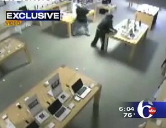 從監(jiān)控錄像看,5名劫匪破窗而入,頭部蒙著面罩,進(jìn)店后便瘋狂開搶。整個(gè)搶劫過(guò)程僅持續(xù)了31秒鐘,有23部MacBook Pros筆記本,14部iPhone(iPhone玩家論壇)手機(jī)和9部iPod被搶。