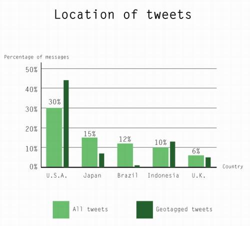根據對一周內所發布的1350萬條Tweets的分析顯示,約有三分之一Twitter的用戶來自于美國。而英國作為另一個英語國家所擁有的Twitter用戶數量則排在第五位,僅有6%的受調查Tweets來自于法國。用戶數量排名靠前的幾個國家依次為,美國、日本、巴西、印尼以及英國。