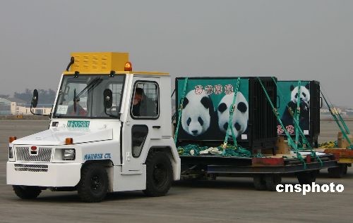 12月23日13時40分,成都雙流國際機場,工作人員正將贈臺大熊貓“團團”“圓圓”運上臺灣長榮航空公司的載運專機。中新社發 霍潺 攝