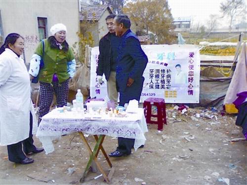 7日,記者現場看到,一個用白桌布鋪好的小桌上擺著牙具模型、補牙、脫脂棉、酒精等治牙工具,兩個破舊的牙具模型上黑色污垢清晰可見,所有工具包括酒精均只看到膠布貼的標識,旁邊是兩把塑料椅,3只杯子,四五瓶藥和六七把拔鉗。大幅宣傳畫靠在路邊的垃圾堆上,一名老人剛看完牙正遞給“牙醫”10元錢。