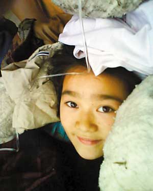 【當(dāng)初】:這個(gè)女孩被埋在一片廢墟中,輸液的管子懸在她的頭頂。然而,她那清秀的臉上露出的竟是甜甜的微笑。她叫高瑩,都江堰聚源中學(xué)初三學(xué)生。在廢墟中被埋20個(gè)小時(shí)后,她被從廢墟中挖出來(lái)了,雙腿都斷了,雙手也被砸傷,可她從被挖出來(lái)到救助站都沒(méi)哭,在大家挪動(dòng)她的時(shí)候,她也只是咬了咬嘴唇。這個(gè)女孩還一邊微笑,一邊對(duì)大家說(shuō):“要勇敢!”