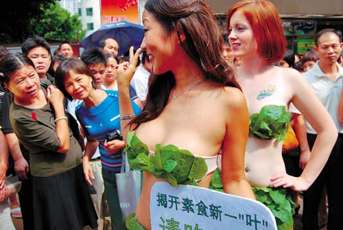 昨天下午2時,北京路商業步行街,兩位自稱來自善待動物組織的外國女孩僅用菜葉擋住身體關鍵部位,大方招搖過市。但見兩位“夏娃”一路高舉標語牌,大聲用生硬中文高喊“請吃素吧”。據了解,這兩位性感女郎來自韓國和加拿大。