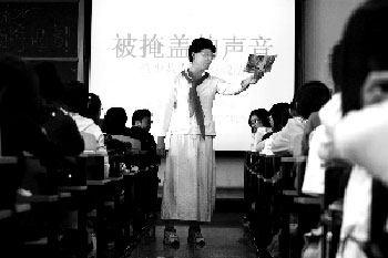 11日下午,易裝戀者曹靖身著白裙向?qū)W生們“講課”。本報(bào)記者 浦峰 攝