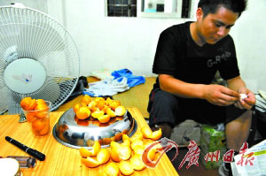 記者根據龔先生的引導,在石溪南約東街附近懷疑有問題的水果檔花2.5元買了25個金橘,一個一個剝開來后,發現總共15個里頭是有蛆的。蛆蟲呈米色,只有不到1厘米長,大都藏在果肉里頭,打開果皮后還能看到它在蠕動。有蛆的金橘摸上去都很軟,里頭的果肉組織往往被蟲蛀成一條條小通道。這種蛆金橘個頭比較小,有別于之前報道的曾發現蛆蟲的那種大柑橘。
