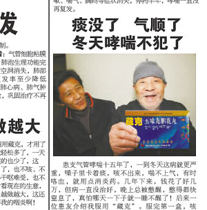“患友介紹我服用了‘藏克’。服完第一盒,咳嗽、胸悶就緩解多了。”昨天,看著我市某報(bào)上的一則藥品廣告,90歲高齡的老人張治欽感到納悶,“我從來(lái)沒(méi)得過(guò)這病,卻上了該藥的宣傳廣告。”