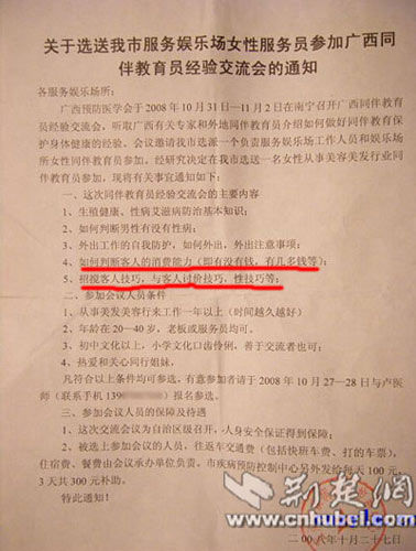 通過“糜瑞蘭”上傳的宣傳單照片,可以很清楚的看到這份全稱為《關于選送我市服務娛樂場女性服務員參加廣西同伴教育員經驗交流會的通知》的宣傳單中,抬頭為“各服務娛樂場所”,落款為“宜州市疾病預防控制中心”并蓋有相應公章,其正文中列明交流會的主要內容包括“……4、如何判斷客人的消費能力……5、招攬客人技巧,與客人討價技巧,性技巧等”。該圖文內容隨即被多個論壇轉載。