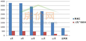 從板塊掛牌量來看,黃浦區近兩周掛牌的新房源僅為850套,人民廣場板塊為95套。此外,黃浦區總掛牌量為3857套,人民廣場板塊總掛牌量為545套。