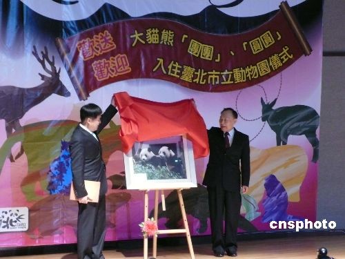 圖為歡送“團團”“圓圓”赴臺代表團團長趙學敏和臺北市長郝龍斌共同為“團團”“圓圓”基因檔案大幅照片揭幕。