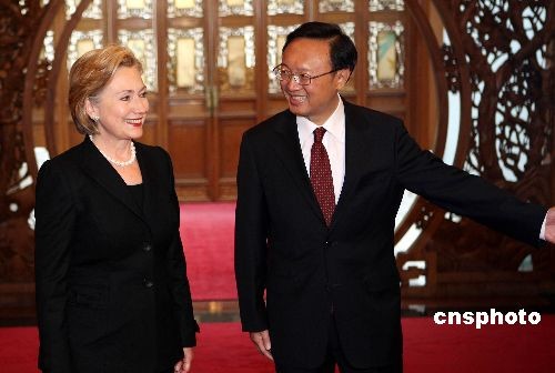 2月21日上午,中國外交部部長楊潔篪與美國新任國務卿希拉里·克林頓在北京釣魚臺國賓館舉行會談。中新社發 任晨鳴 攝