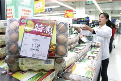 在沃爾瑪超市宣武門店,重新上架的咯咯噠雞蛋降價(jià)促銷。記者王磊攝