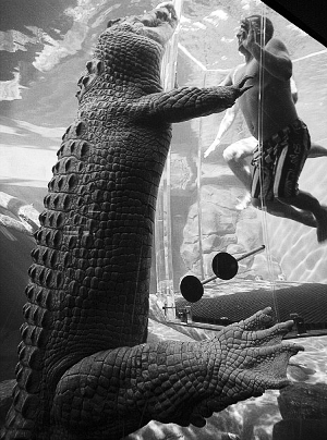 據(jù)報(bào)道,頭戴潛水鏡,身著泳衣的游客需要先爬進(jìn)2.7米高的“死亡之籠”,再與籠子一同沉入鱷魚池,觀看咸水鱷“肖普”。