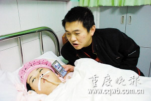 “小豬兒,來,聽聽歌曲。”昨日上午11時,巴南區人民醫院神經外科病房,42歲的趙江用手機播放著“你問我愛你有多深”。病床上,女友朱永萍眼睛似閉非閉,毫無反應。