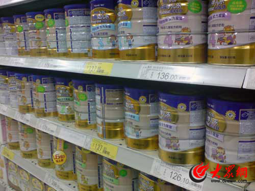 24日上午,記者在大潤發(fā)歷下店和濟南銀座商城的奶粉柜臺看到,惠氏奶粉仍然擺在貨架上,價格也未發(fā) 生變化;而在家樂福超市,記者看到惠氏奶粉已經(jīng)被擺上了促銷柜臺的顯著位置,記者注意到,惠氏2段S26金 裝健兒樂900克聽裝奶粉當(dāng)天售價仍然是178元,而惠氏3段S26金裝健兒樂900克聽裝奶粉售價已從155.8元直降 到137.8元,降幅達到18元。銷售人員告訴記者,惠氏被曝光的事她已經(jīng)知道,但并未接到下架通知,盡管她表示惠氏降價與“結(jié)石門”無關(guān),但記者從價格標(biāo)簽上看到,降價銷售的標(biāo)簽是24日當(dāng)天新?lián)Q的;在沃爾瑪超市,記者看到惠氏同樣在降價促銷,降幅與家樂福相同。