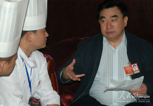 全國(guó)人大代表、湘菜大師許菊云與酒店大廚在進(jìn)行交流。人民網(wǎng)記者 李昉 攝 人民網(wǎng)北京3月3日電 (記者 李昉) 食品安全事故的發(fā)生,在一定程度上對(duì)消費(fèi)者造成恐慌,讓民眾對(duì)食品安全產(chǎn)生信任危機(jī),這也成為了今年兩會(huì)廣泛關(guān)注的話題之一。那么,如何才能堵住食品安全生產(chǎn)漏洞呢?全國(guó)人大代表、湘菜大師許菊云建議嚴(yán)把源頭、餐桌、意識(shí)三道關(guān)。