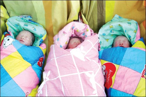 由于家里經(jīng)濟(jì)困難,這次直到懷孕5個(gè)月時(shí),童芳才在丈夫的陪同下到醫(yī)院做B超檢查,發(fā)現(xiàn)懷的竟是三胞胎。“當(dāng)時(shí)我又開(kāi)心又擔(dān)心,開(kāi)心的是竟然一次懷了三個(gè),擔(dān)心的是怕三個(gè)全是女兒。”童芳坦言。