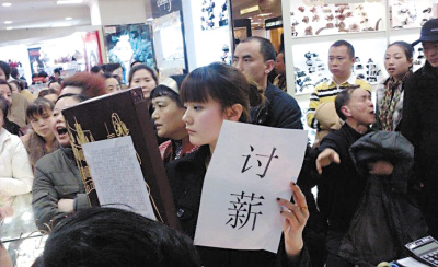 “三八”節(jié)本該是婦女的節(jié)日,然而這一天重慶解放碑鬧市某商場卻出現(xiàn)了一名漂亮女子舉紙條討薪維權(quán)的場面,驚動了110民警。原來,這名討薪女子是廣州一家公司駐該商場的營業(yè)員,因未接待顧客被公司罰款100元,拒交后又遭到調(diào)崗處理。雙方關(guān)系“拉爆”后,遂來到商場追討千余元欠薪。昨天,經(jīng)渝中區(qū)勞動局介入,當事雙方已達成協(xié)議,公司方面支付了她3年多的保險金,欠薪也即將支付。