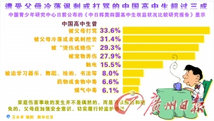 該調(diào)查顯示,33.6%的中國(guó)高中生曾“被父母打罵”,29.3%被“燙傷或燒傷”。對(duì)于父母是否有權(quán)利打罵孩子,各國(guó)高中生的態(tài)度不一。85.0%的中國(guó)高中生反對(duì)“父母打罵孩子是自家的事,別人沒有權(quán)利干預(yù)”,在四國(guó)中比例最高。