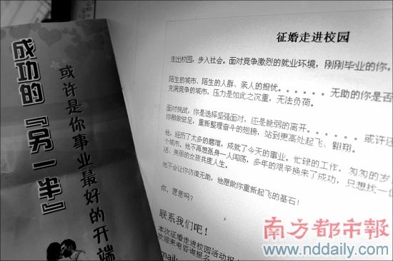 下午4時,記者再次登錄深大校園網,發現征婚帖子已被人刪除。隨后,記者亮明身份再次聯系該公司,一位負責人表示,這次活動是專門針對大學里的大四畢業生的,印刷了2000份宣傳單,聘請了學校里的大學生兼職發放,并在校園論壇上發帖子,宣傳單和帖子都表達得很含蓄。該負責人稱,之所以有這樣的想法,是因為有認識的朋友想找剛畢業的大學生,喜歡大學生“經歷少、不復雜”,而公司了解情況發現,不少大學生也想趁年輕時早點解決個人問題,找經濟條件好一點的對象。雙方都有需求,于是她計劃在6月底7月初大學生畢業的時候搞一場交友活動。有不少電話咨詢,但還沒有人報名。