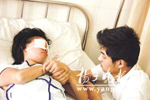 在醫院眼科搶救病房里,記者昨天下午見到雙眼蒙著紗布、躺在病床上的小雨,她雙手拉住坐在一旁的丈夫不愿松開。據小雨的丈夫梁偉介紹,他與妻子是在常州打工時認識的,兩人于2007年年底結婚,在結婚前,妻子就知道他有一個患精神分裂癥的弟弟。
