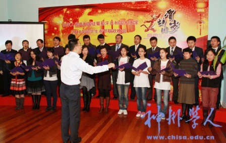 隨后,聯(lián)歡晚會在《我和我的祖國》的歌聲中拉開了序幕。留學生們和使館工作人員獻上了形式多樣的節(jié)目:舞蹈《蒙古舞》、《金梭和銀梭》,小品《吃面》、《賣拐》,男聲獨唱《故鄉(xiāng)的云》,女聲獨唱《父老鄉(xiāng)親》,配樂詩朗誦《致橡樹》等等。精彩紛呈的表演時時引來熱烈的掌聲和喝彩聲,會場上始終洋溢著歡樂祥和的節(jié)日氣氛。