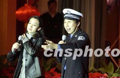 著名相聲演員馮鞏,二十一日一身警裝在北京為公安警員表演相聲,向他們致以新春佳節的問候。作者:任海霞