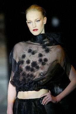1月26日,羅馬時裝周上模特展示了2004春夏時裝最新流行趨勢。圖為模特展示意大利設計師Gai Mattiolo 的作品。